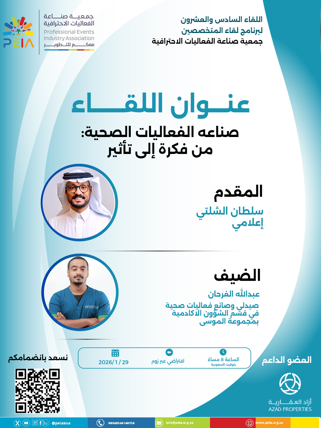 جمعية صناعة الفعاليات الأحترافية جمعية صناعة الفعاليات الاحترافية هي جمعية اهلية مهنية غير ربحية تتكون من أعضاء لهم علاقة بصناعة جميع انواع فعاليات الأعمال ولديهم الرغبة بتأدية خدمة اجتماعية تطوعية