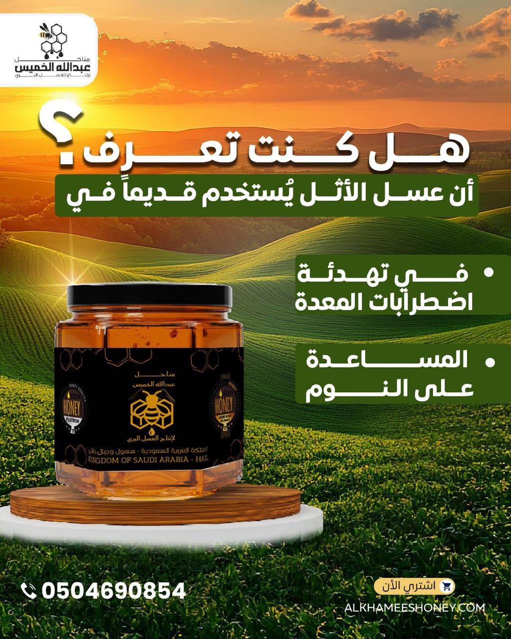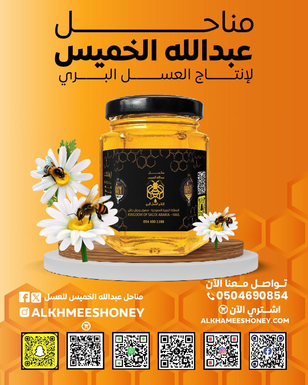 مناحل عبدالله الخميس متخصصة في إنتاج وتعبئة العسل الطبيعي 100% من مناحلنا الخاصة في شمال المملكة العربية السعودية، في مناطق مثل حائل ومحمية الإمام تركي.
